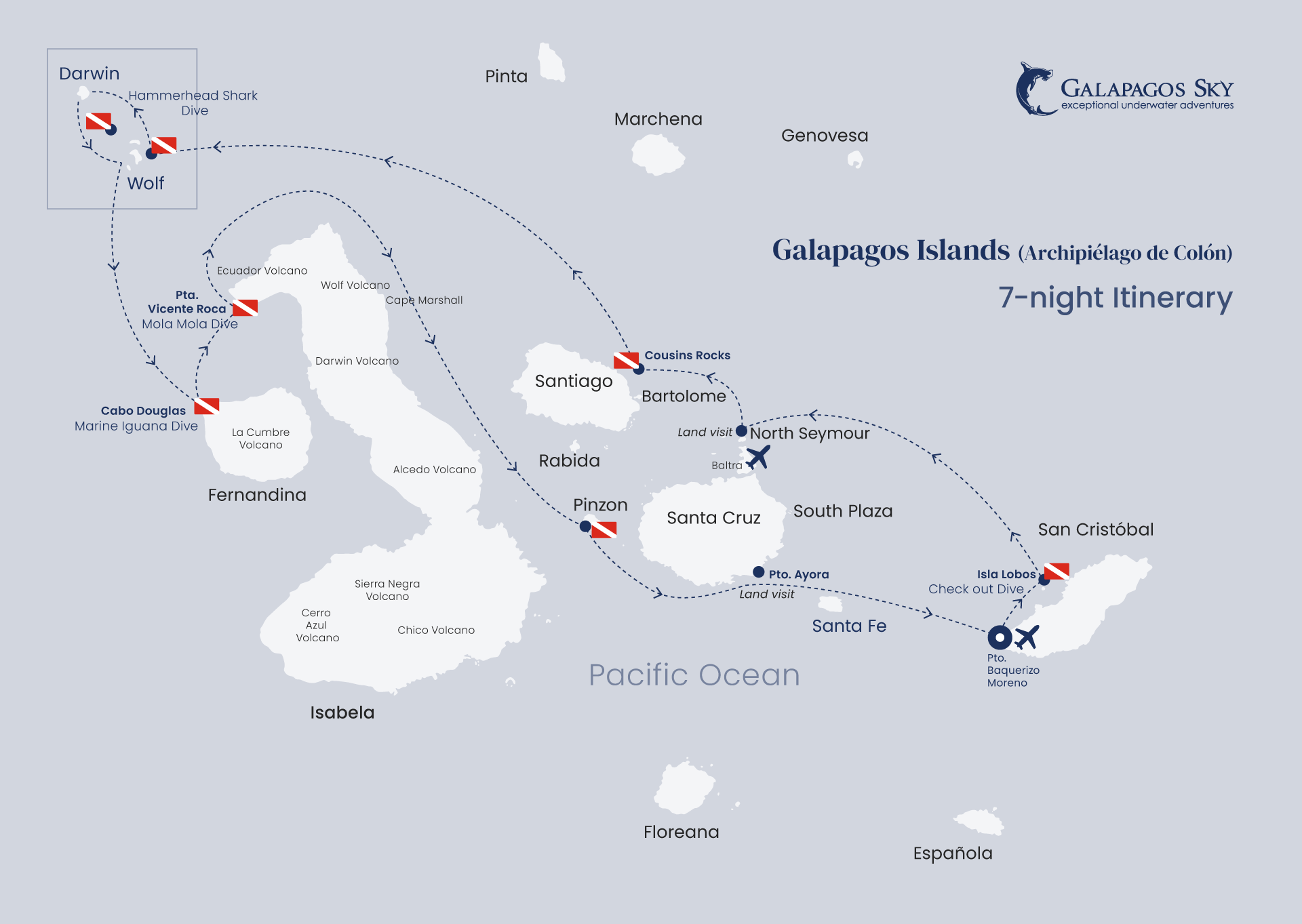 On the 7-night cruise, we spend 3 full days at Wolf & Darwin, on the 10-night cruise we spend 5 days at Wolf & Darwin. On the 10-night cruises we also have an additional day that allows us to dive at Cabo Marshall / Roca Blanca which is not on the 7-night itinerary. All 7-night cruises embark and disembark from San Cristobal SCY. All 10-night cruises embark and disembark from different islands. Example: Embark San Cristobal SCY and disembark on Santa Cruz/Baltra GPS or Embark Santa Cruz/Baltra GPS and disembark San Cristobal SCY.